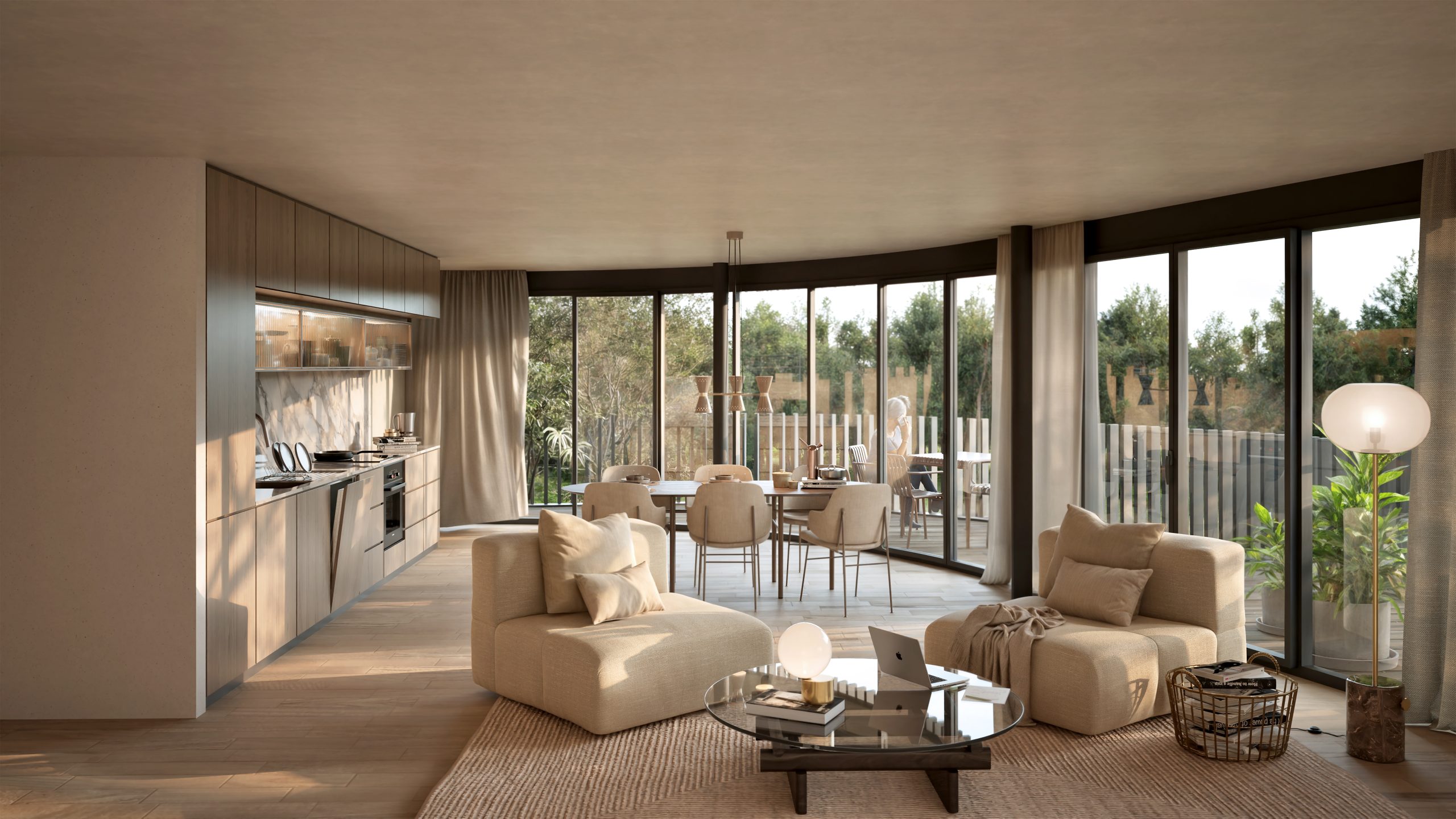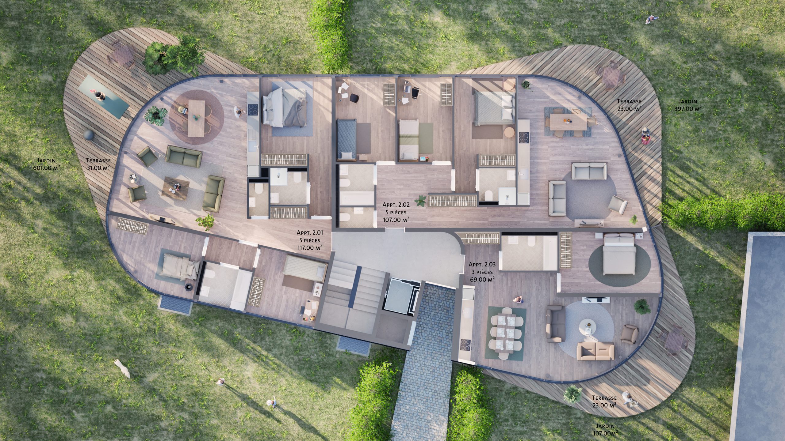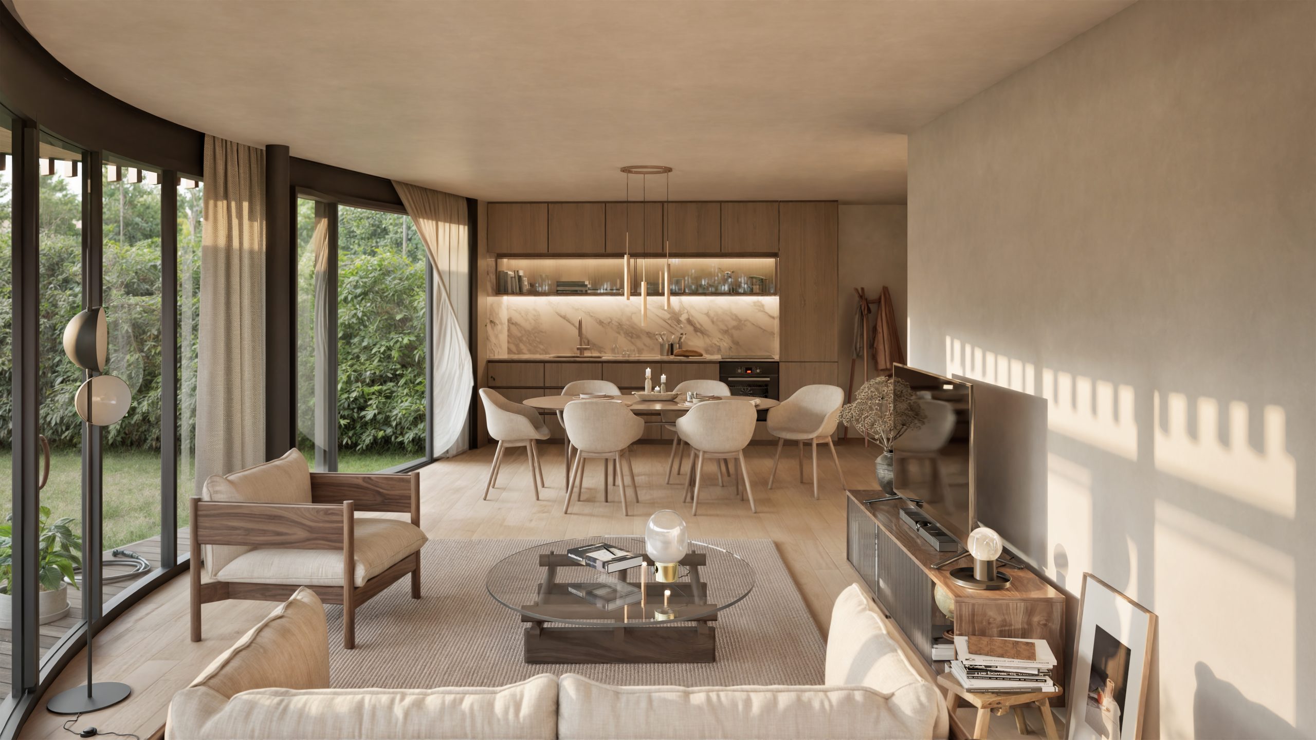 Chaque logement est pensé comme une extension du paysage : les espaces intérieurs, baignés de lumière par de grandes baies vitrées, s’ouvrent sur d’amples terrasses ou de vastes jardins, dans un jeu permanent entre dedans et dehors. Le confort y est partout palpable – parquets en chêne, cuisine ouverte sur le séjour, pièces de nuit bien séparées, stores à lamelles motorisés – tandis que les finitions révèlent une attention portée au détail et à la qualité des matériaux.